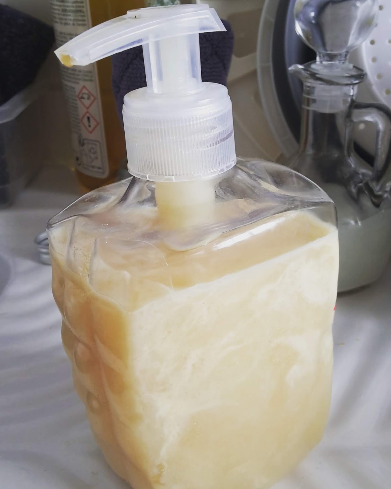 Attention utilisez le savon une fois que celui ci est bien froid. J'en ai eu un peu sur les doigts en versant ma préparation encore chaude dans le flacon et quand j'ai voulu me rincer les mains, elles étaient toutes huilées et l'eau perlée sur ma peau ! Je me suis dis alors que ma recette était nuuuuulllleeee ! Mais je vous rassure, le lendemain c'était parfait, il fallait juste que le liquide refroidisse. J'étais rassurée ouf !